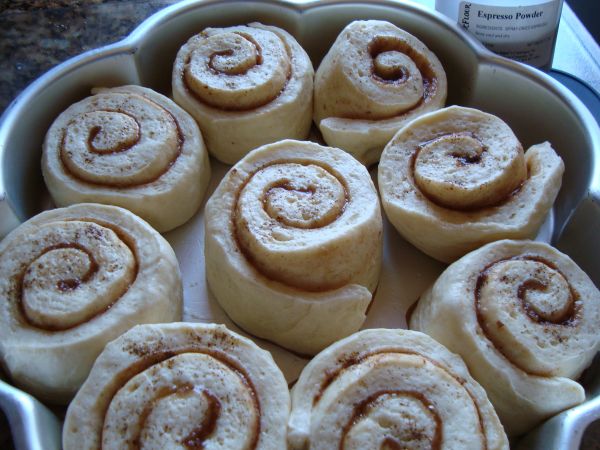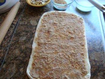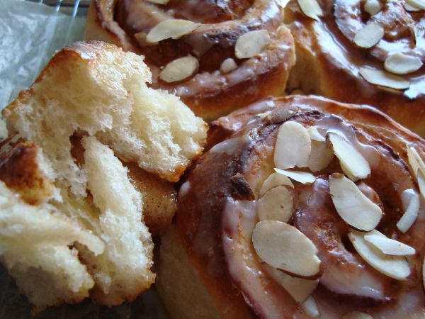Almond-Scented Cinnamon Rolls- I know more cinnamon rolls..but these are a little different and a delicious Italian version!  My husband has been begging for cinnamon rolls and it has been a while...so I thought I would make some with an bit of an Italian flare..this is my adaptation from a recipe on the http://www.rusticocooking.com.  The dough is easy and comes together so fast in the food processor.  This is the first time I have made dough in a food processor..I have to say I was amazed.  I also liked the fact that they added the butter before the liquid ingredients because I think this does make a difference! You get a more tender crumb by discouraging the onset of the gluten formation.  I think this definately makes a difference even with little bit of butter that goes into this dough!  No eggs are in the recipe!  I used King Arthur All-Purpose flour.  I mixed the dough the night before and without shaping the rolls, placed the dough in a lightly buttered bowl.  Placed in the refrigerator overnight and the next morning let it warm up to room temperature and then rolled out the dough and formed the rolls.   I doubled the filling replacing half of the flour with Almond Meal and adding a little brown with the granulated sugar.  I used only buttermilk in this recipe.  When the rolls were glazed I kept the glaze thin...not a thick glaze like my cinnamon rolls usually have and just before baking I added a very light sprinkling of King Arthurs expresso powder on the proofed rolls.  When the rolls where finished baking I removed them right away from the pan...I would suggest parchment lined pans instead of just buttering the pans.  I glazed the rolls and made double the recipe and used it all...topping the glaze with slivered almonds.