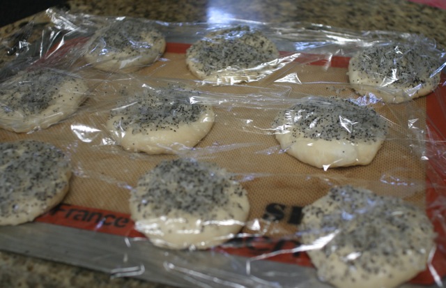 Cover the onion rolls lightly with plastic wrap and let fully proof, about 1 hour. Just before they are ready to go into the oven, press down in the center of each roll with your thumb to make an indentation.