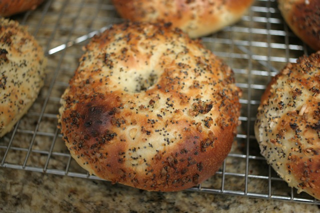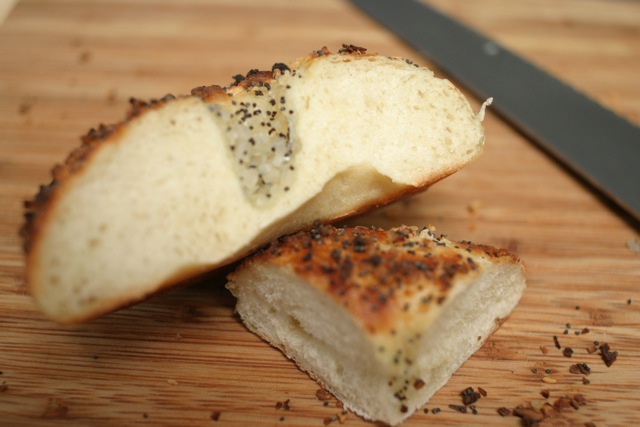 I really like Norm's method of using re-hydrating dried onions. They tasted fabulous on the rolls. The dough was very stiff and tight when I removed it from the mixer for bulk fermentation, but when I went to shape it was amazingly light and easy to work with. I don't know why I expected the finished product to be bagel-like. These rolls are light, tender things with a mild onion and poppy seed flavor, and nothing like bagels! I couldn't help myself and gobbled one down before they were even cool. Thanks, Norm, for sharing this terrific recipe with us at TFL.