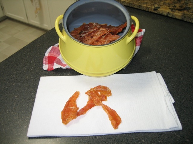 I buy Foster Farms frozen boneless, skinless chicken breasts at Costco and defrost about 6 of them at a time. When they are still a little frozen, I slice them real thin and lay them on cooling racks. I can cook 3 racks at a time in the oven. It takes 12 hours at the lowest setting (120º). I keep the oven outside, put them in about 7PM and take them out the next morning at 7AM. We go through a lot of them with two dogs, but our dogs are real trim and we think it is because we don't fed them any junk. The chicken strips are their treats. I break them into little pieces for them several times a day. We joke about the work and expense saying that since they are human-grade, their our earthquake supplies. Our dogs eat better than a lot of people!