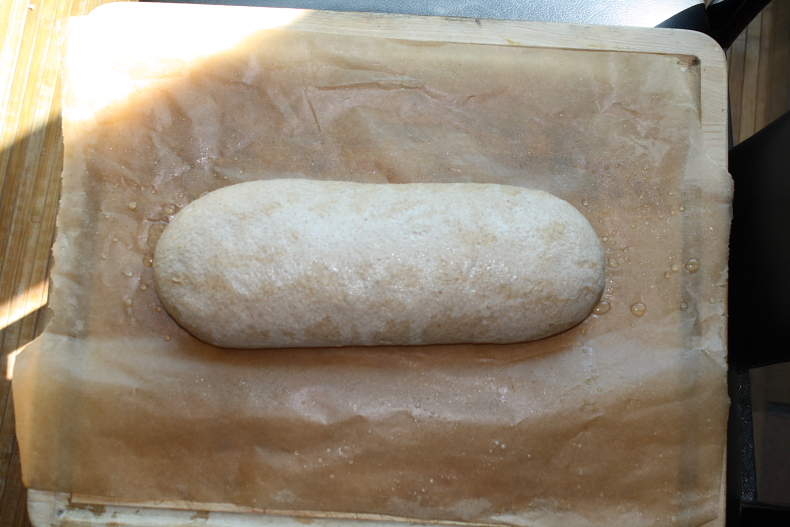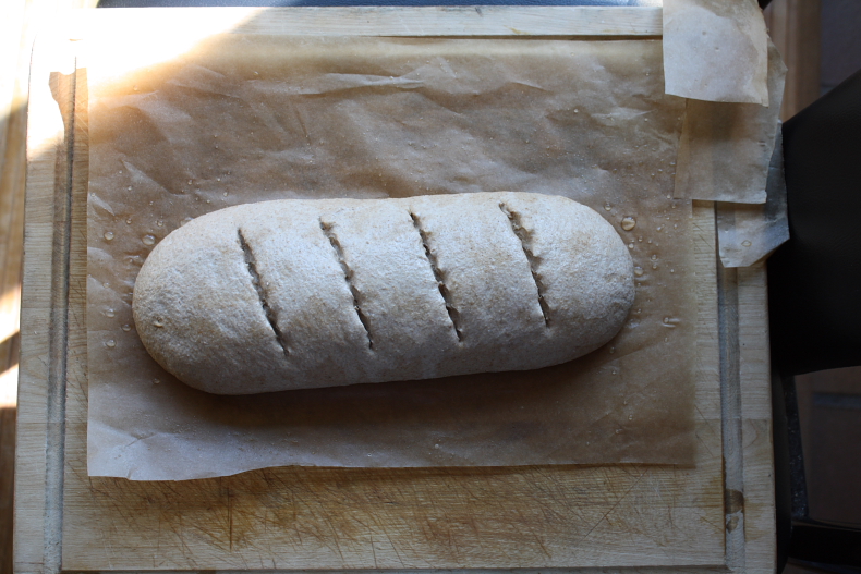 I couldn't have let it proof longer to dechil, it'd have become overproofed. What I should have done is, before shaping the dough, I should have evened out dough temparature everywhere by kneading it out a bit (just one or two hand kneads should've done it). Then the loaf could've proofed evenly, outside and inside.