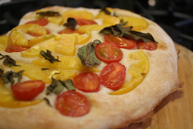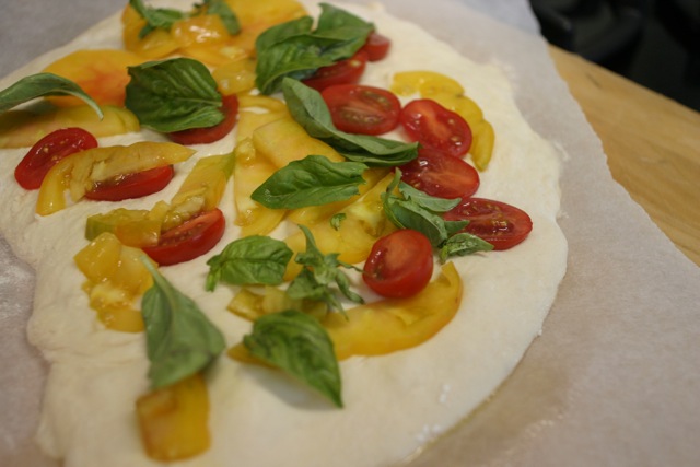 The pizza formula has a lot of yeast in it and went through bulk fermentation like a rocket (I had to put it in the fridge to slow it down.) When it had tripled (after about 3 hours in fridge--probably faster but I just let it sit there until I was ready), I heavily floured my counter, literally poured the glutenous dough onto the flour, and then sprinkled more flour on the top. I patted the blob into a circle about 1/2 an inch thick. Then the trick was how to get the blob onto the pan-sprayed parchment. I did the best I could but had to reshape it a bit after it landed. Didn't seem to hurt it any. I topped it with tomatoes and basil (topping basil was an obvious mistake at this point because it dried out in the oven--next time I'll put it on as a garnish; sometimes in the heat of the moment I do stupid things).