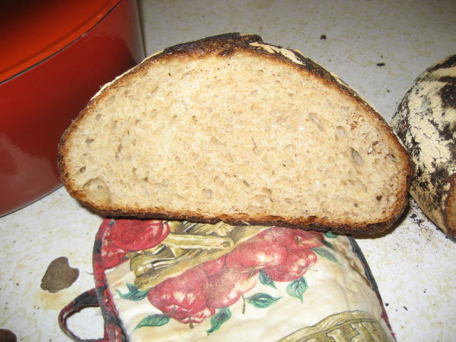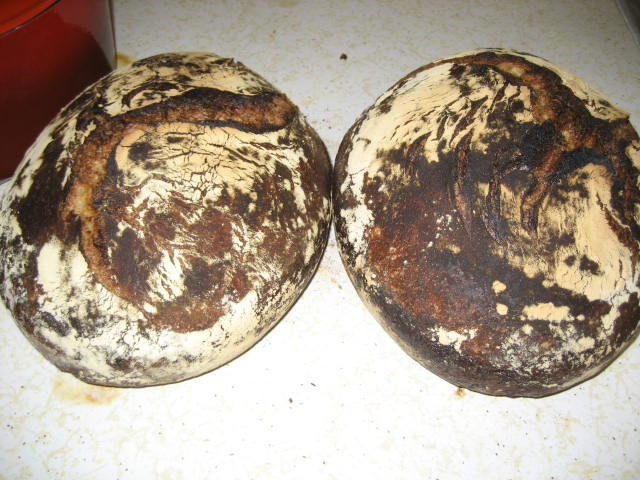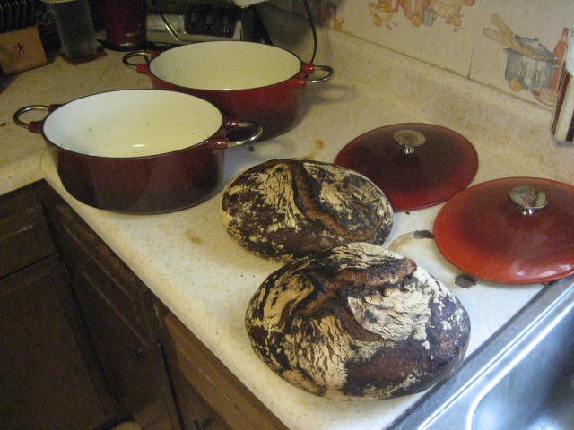 I made the no knead again today.This time I used 1/3rd whole wheat and 1/2 cup honey in the double batch dough.Baked in dutch ovens 30 minutes @ 500 degrees covered and 15 minutes uncovered.Bread is very tasty but the crust is black.Gunna do the same concoction again except I'll drop to 450 degrees and see if it'll prevent the burnt crust.Seems like the honey or the whole wheat flour or both are easier to burn than plain bread flour.I can't give this away because of how it looks.So....I will just have to eat it.I actually kinda like the char taste.Cut meself a couple slabs hot from the oven,slathered on half stick real butter and with a cup of good ol "members mark" sam's club coffee I had a pretty good lunch.Here's pics.Ok guys,now tell me something I don't know.Please/Thanks