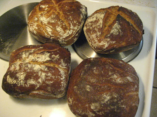 Well after the no knead sat for 19 hours plus the 2 hour proofing I did another bake.This time I used more honey 2/3 cup but I also made 4 small loaves instead of the 2 large.I lowered to 450 for the first 30 minutes covered and then to 380 for the remaining 15 minutes uncovered.Still crackling crust but didn't burn it this time.The extra honey however I will admit was too much for my taste.If I make this honey wheat again I'll use the 1/2 cup.I like the ratio of 4 cups bread flour/2 cups whole wheat flour.One of my loaves (bottom right) is lower than the others,and I think I was too rough handling the dough when I was getting it into the corning ware thing.It tasted good though and has good chew,big bubbles.Maybe I just didn't use as big a piece of dough.Dunno.