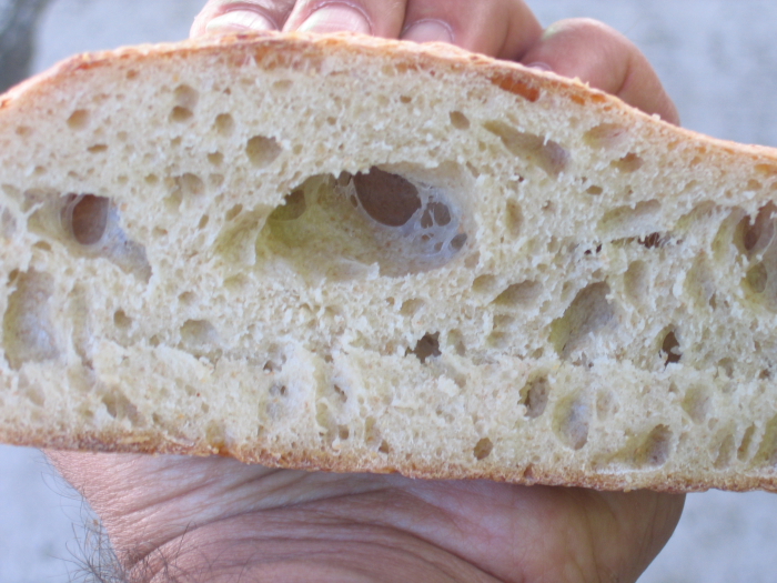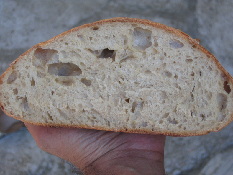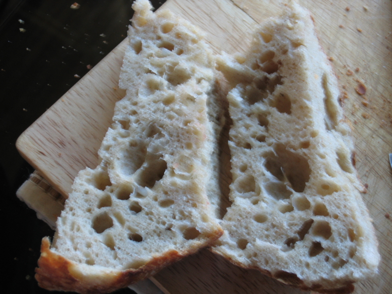 Pictures from today's bake. My camera died on me, so I have pics only of half a loaf (don't ask) and that's why the second pic looks triangular :