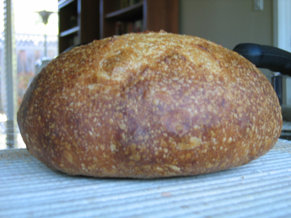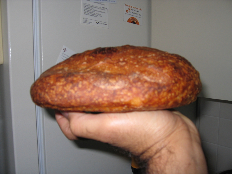 My observation was that the dough had a LOT more strength today when I increased the initial mix time, and did more frequent S&Fs. The oven spring was the best I have had. As you can see, the scoring marks completely filled out, and the bread held its shape better than yesterday (this was a 1.5 pound loaf, 8 inches diameter, and 3.75 inches tall). All in all, I am happier with the shape of the bread and the massive ovenspring, and the scoring marks are my best effort yet.