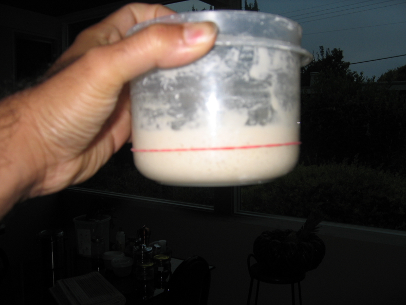 Levain build when I used it this morning, rubber band indicates height at time of mixing yesterday evening. It is about 1.5-1.75 times the height of what it was yesterday: