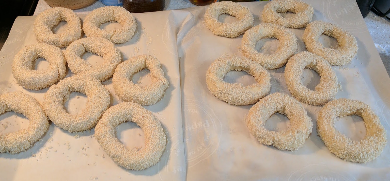 I formed, boiled, seeded, and baked 6 bagels at a time so that the formed bagels didn't have much time to rise.