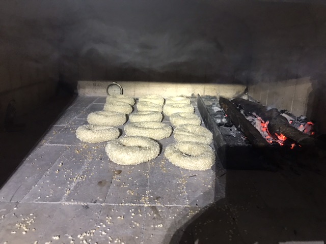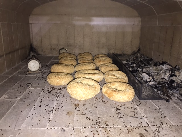 I returned some of the coals to the oven and put a piece of angle iron to shield the bagels from any direct flame. The small pieces of wood I put on the coals to make a small amount of flame didn’t catch so much as smoulder and created too much smoke. And the temperature of the oven started falling below 400F with the door off. So after 4 minutes on bagel boards, I flipped the bagels onto the hearth. I then removed the pieces of smouldering oak, and sealed the oven shut with the door. This brought the temperature back up to about 450F, and the bagels came out of the oven after 20 minutes total time. I like them a little light, and with loads of sesame seeds, so they were perfect for my taste