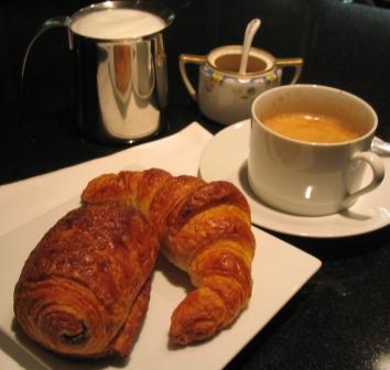 A croissant with cafe au lait for breakfast always transports me back to my first visit to Paris in the spring, sitting at a sidewalk table at the Cafe "La Rotonde" in the Montparnasse area, sipping a cafe creme and eating a croissant with confiture, watching the morning bustle and hustle of Parisian life just like Hemingway, Picasso, Nijinsky, Gershwin and other luminaries had done at the same spot so many years ago.