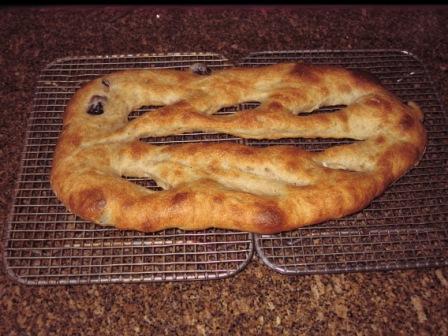 The bake turned out nicely, I think, and the reaction of my pub companions with whom I shared the loaf was positive. It yielded a nice crust, and a chewy crumb infused with flavor from the olives and the olive oil. This is a wonderful snack-type bread that will disappear quickly, as it should. With its large area of crust, including that around the decorative slits, it's not meant to store but bake and eat soon as it's cooled sufficiently.