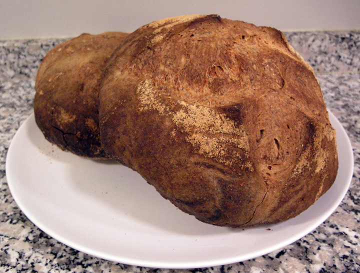 I wanted to thank Shiao-Ping for this post, and post my improvisation of this recipe/formula.  I did not use any rye flour as I ran out, I upped the hydration to about 75%, refrigerated during the bulk fermentation for about 21 hrs, shaped it out of the fridge, and proofed them for 3 hours, baked them for just over 1 hr at 450F with steam...