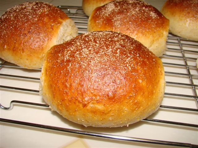 I find that folding the dough during fermentation to build strength and shaping tightly gives nice round rolls that hold their shape. To get hamburger buns I don't make the dough as strong and shape more loosely so it will spread out into hamburger bun shape during proofing. I think this bread makes better rolls and pullman style loaves than hamburger buns because it is a little too sweet (for my taste) for hamburgers.