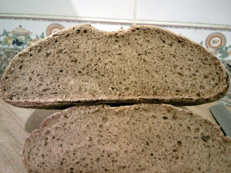 Taste? mmm.. it was sourdough, though some 1.6 tsp of yeast was used in the final dough. The bread tastes: Wholesome- Soury- Fibery- damp- chewy - Crusty. Thats is the way i felt when i took a bite. Regrets? Would skip the Wholewheat starter and go for a yeast poolish to somewhat reduce sourness, though the bread was mildly sour.