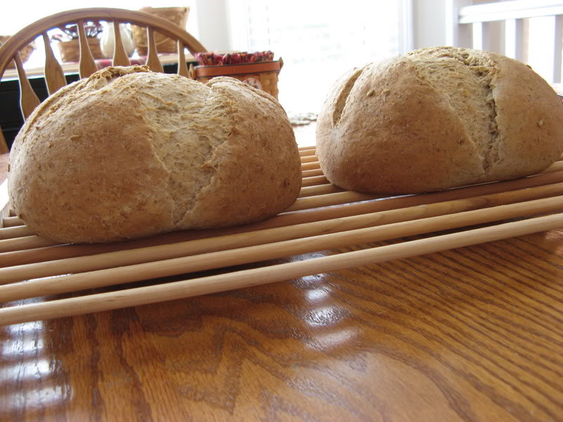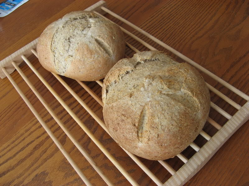 I selected a buttermilk rye with fennel seeds. During a recent trip to the store, I had picked up some buttermilk with no particular recipe in mind, so I had some on hand. My wife does not enjoy caraway, but she does like fennel and it goes well with rye. So, when I happened across that recipe, it was an easy pick. Here are a couple of pictures of the finished loaves: