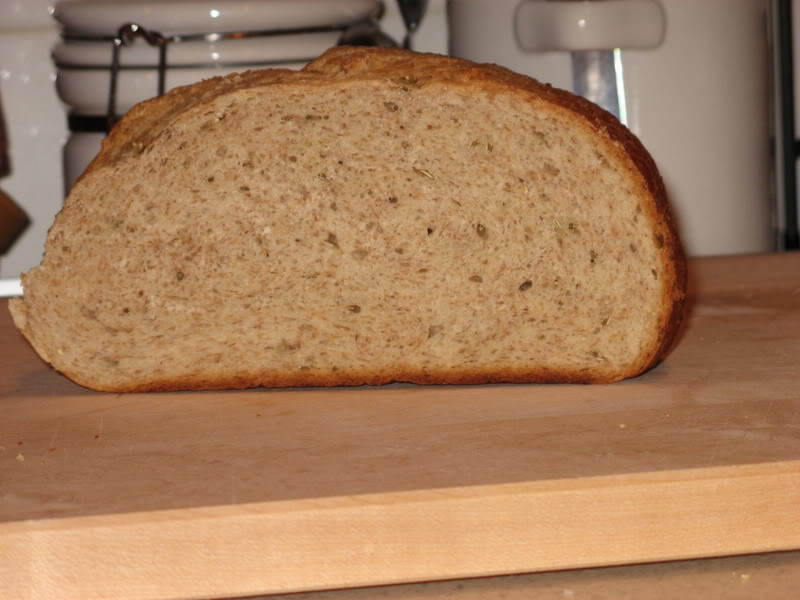 As can be seen in the photos, I should probably have given it a little longer to rise, although it was already doubled in size. That may have reduced some of the splitting. It might also have helped to use some steam during the first few minutes. The recipe calls for baking the bread on a baking sheet but I baked it on a preheated stone, which probably contributed to a larger than expected oven spring. Whether in spite of, or because of, my tweaking, the bread is delightful to eat. The crumb, while close-textured, is not dense. The bread is moist and chewy and makes a great base for sandwiches. The fennel contributes a pleasing crunch, in addition to it's fragrance.