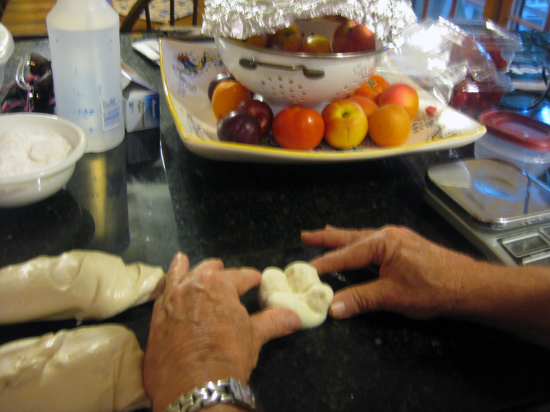 Here's a new batch of Rosette I did yesterday stamping 6 with the apple slicer and 10 with the professional rosetta stamp. I got pretty good puffing, but still not my usual results. The last picture shows the inside, stamp on left, apple slicer on right. I'm pretty sure the missing factor is more heat. I pre-heated to 500F this time, but I think I get better results when I pre-heat to 450F and then turn up the heat to 500F a minute before baking. This keeps the top heating element red-hot during the first 5 minutes. I did this on the last batch of 4 and got much better puffing. I also raised the height of the rack to get it closer to the top element, but risked too much browning. Next time, I think I'll try putting the oven on the broil setting to see what happens. This should keep the top element red-hot, but I'll lose convection. I got pretty good puffing on the ones using the apple slicer, too. The picture show the folding technique and the points at which I spritz during baking. I do one last spritz during browning to get some shine. I wish I had a steam oven. I'm pretty sure the main factor to getting a good puff is lots of heat. I took a batch of risen rolls to my pals at the Taste of Italy pizzeria here in Woodstock to bake in their pizza oven at 550F. They put them in the back of the deck and they puffed like crazy. Even got the slightly burnt bottoms like the ones in Rome.