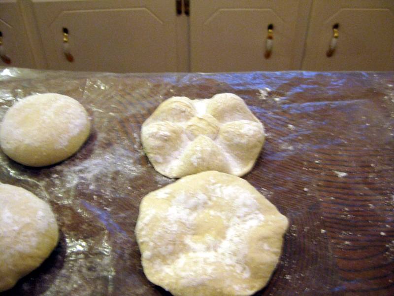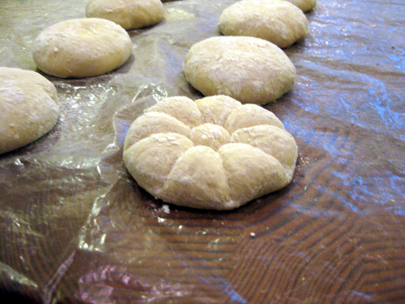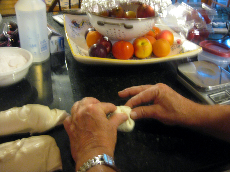 Make a tight ball, mash it down into a disc, then fold the 4 sides to the center. Push the center to form a pocket. Holding each corner, push the corners up to meet, thereby trapping the pocket between them. Seal all edges and pull up into a tight ball. It should have a dimple where the pocket was formed. First rise with the dimple up, flip and stamp with the dimple down. This puts the pocket on the bottom center of the rosetta.