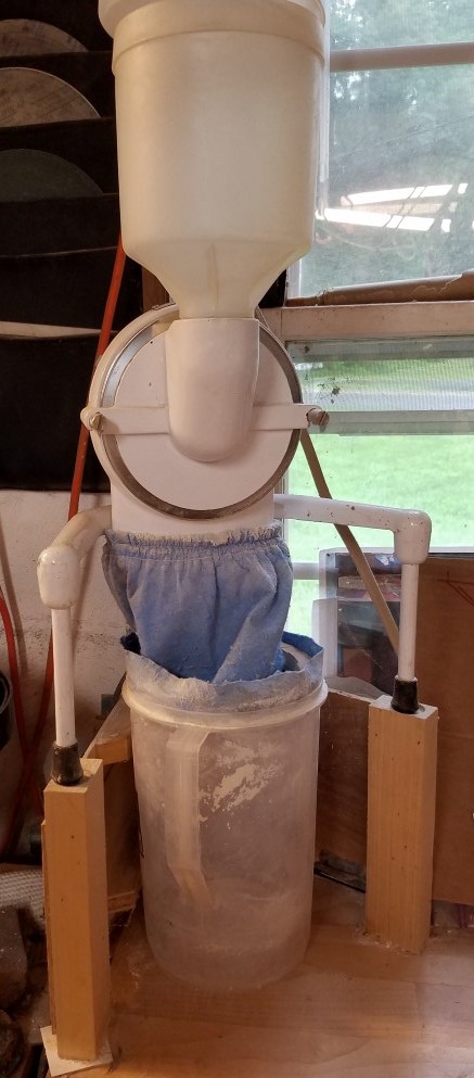 Now I use the bags to feed into a pitcher. First, I built a little stand to elevate the mixer, then cut the bottom off the harbor freight bag so that it is a tube, then made a circular piece of wood so that it would fit inside the harbor freight bag, and form a friction fit with the inside of the plastic pitcher that I use for collection. Another method would be to use a rubber band to wrap the other end of the bag onto a container .