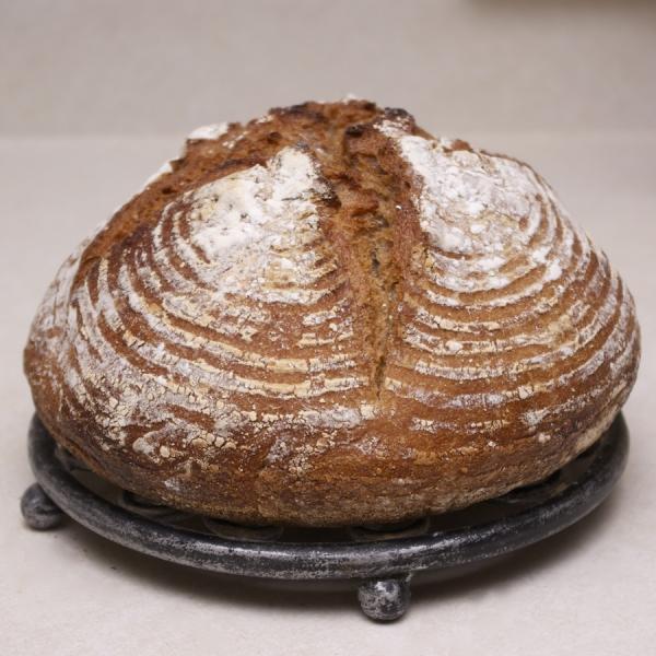 ..with the freshly ground flour produced by this Lee Flour Mill. (Ingredients: only 100% whole wheat--whole kernels with hull/bran--flour produced by this mill, salt & water, sourdough culture.) 20% of the total carbohydrates is fiber, yay! This loaf tastes great!