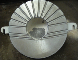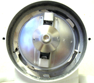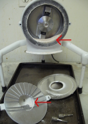 The centrifugal action of the grain propeller also creates a vacuum that pulls lots of air through the grinding chamber and keeps the chamber cool. (The temp of the flour was 90 degrees when finished and room temperature was near 80.) This high volume of air keeps surfaces cool and blows the grain (flour) into the exit chute through an adjustable ring that meters from very fine to coarse.