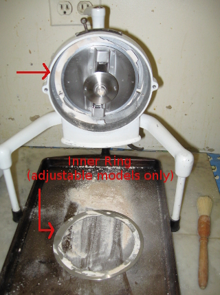 Remove the milling ring. In the adjustable models (600 & S600), there is an inner ring behind the milling ring. Remove it also. Flour residue builds up at the rear of the milling chamber. For adjustable models, wiggle the adjustment lever back and forth to make sure it moves easily.