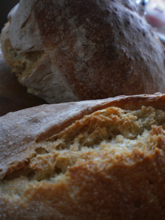Day #2, ignore the bowl all day (at work), then when I got home, I took out the dough, formed it into rough baguette-ish loaves and let them proof/come to room temperature for about 45 minutes while the oven was preheating. Baked for 20 minutes and had fresh bread for dinner, just a bit over 2 hours from the time I walked through the door.
