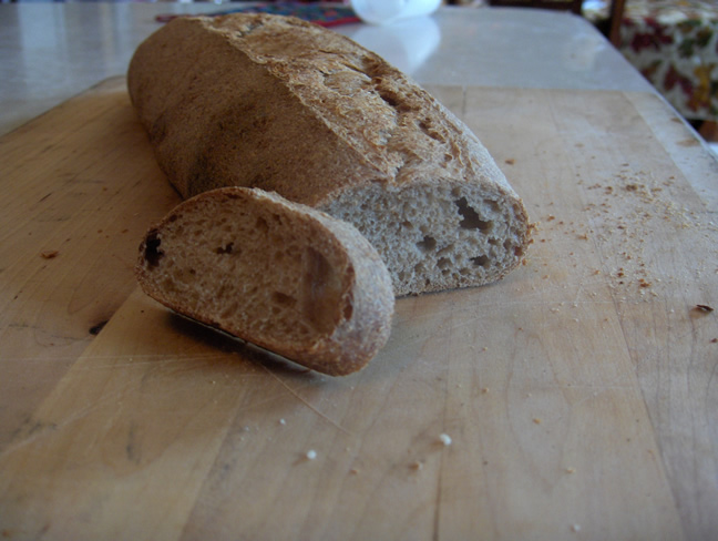 After the loaf is formed you can do two things, cover it and let it rise to about doubled. I use spray oil to lubricate a piece of saran wrap so it won't stick to the loaf. Again, this takes about 1-3 hours for me, your mileage may vary. About halfway through the second rise preheat oven to 450. Steam the oven, slash the loaf and put bread on a stone or cookie sheet. After five minutes I give the oven another spray for more steam. After another five minutes I give the bread a turn for even browning and reduce heat to 425 for another 15 minutes or so. Here's how the white bread turns out...