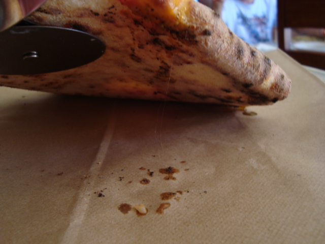 See those tiny little black specks...that's the semolina that was mixed with the flour on the wooden paddle.  Not recommended!