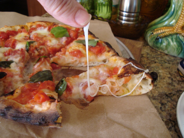 For a while there I thought that was like a Chicago-style pan pizza, what with the crust all high.  And then I saw the bubbles on the crumb.  Wow!  My pizza crust don't rise that high ever, but it must be your WFO.  I want one in my next house!