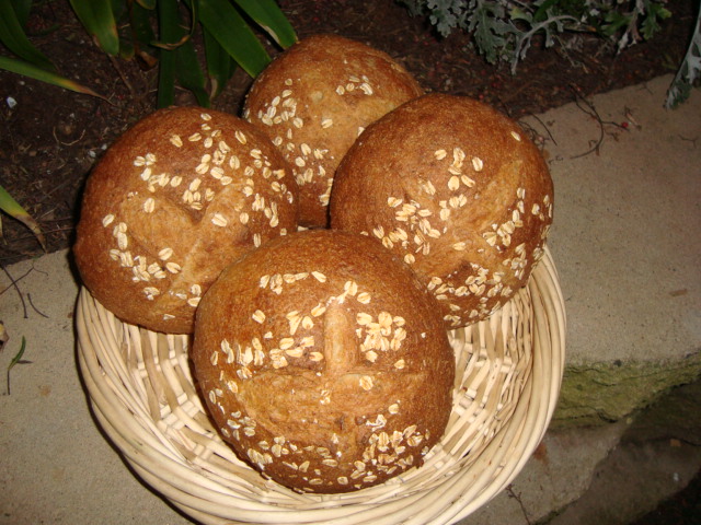 We love Oatmeal bread so I made 4 small boules of J. Hamelman's recipe from his book 'Bread'.  I also made Susan's Sourdough..Oh it tastes wonderful!  I'am still learning about the heat in my oven and experimenting with the steaming.  I would like to have seen the boule open up more..next time I'll try the oven even hotter and more steam.  I didn't overnight the final proof but it did get a long stay in the frig today along with the Oatmeal loaves.  Getting everything ready 'oven heat and temperature leveled out and loaves proofed' at the same time can be challenging and will take a more baking than I have been doing in the wfoven.