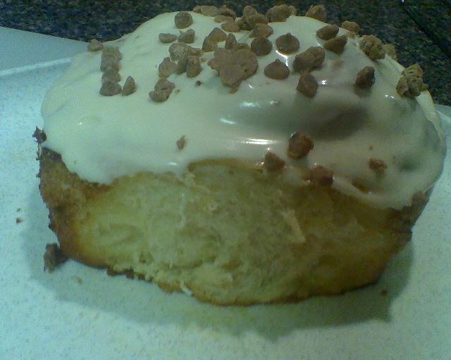 Iced with a vanilla cream cheese icing and sprinkled with extra cinnamon chips. Melt in the mouth tender and heaven on a plate.