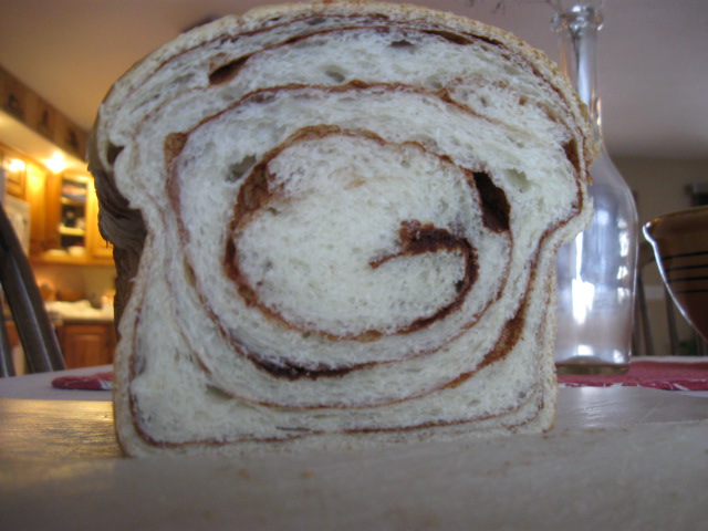 decent crumb.. perhaps a bit more closed than i would prefer, but I tend to get pretty firm with my shaping on these babies, as I despise the spirals separating.....I normally flatten out dough, then spritz with water...sprinkle w/ cinnamon and sugar, spritz again with water...then roll...as long as I am firm with my shaping they stay together...as soon as I try a gentler hand, they separate...so if any of you out there in loaf-land have any better methods to keep the spirals from separating, while maintaing the air...let me know...