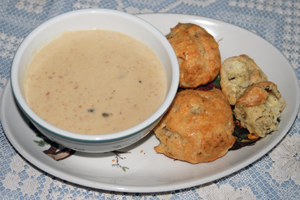 While the puffs are baking, I decide to take a stab at a package of soup I got from my Brother-In-Law, who travels to Finland frequently. I can't read a word on the package but fortunately there some pictures for us dummy's who don't read Norwegian. I'm hoping hansjoakim will help me out here to tell me this was great mushroom soup and not reindeer testicles. Either way it was delicious! I guessed at 2 cups water, simmer 5 minutes and add 2/3 cup of light cream.