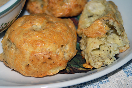 Black Pepper and Thyme Gourgéres is a wonderful light and airy appetizer I love to make. I was in the mood today for a savory quick and easy bread product to go along with a soup mix I had in the pantry. I think the soup was the motivation for the cheese puff but it could of been the other way around.