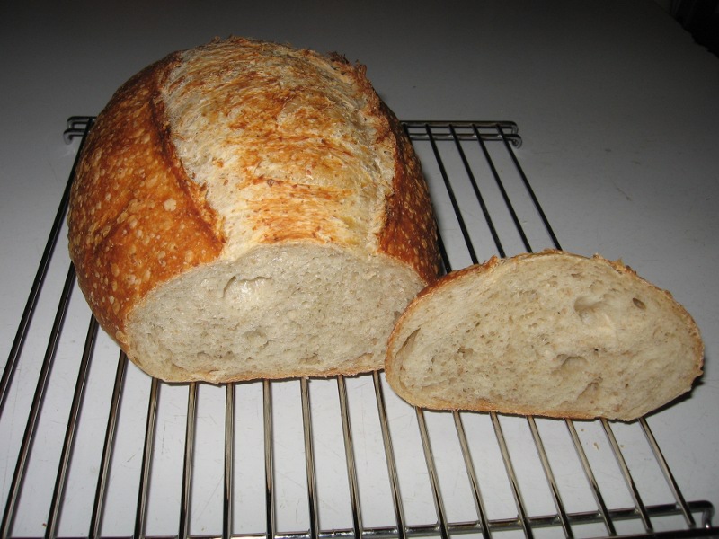 Thanks for the recipe.  I gave it a try and here are the results.  I baked it in a home oven on a baking stone using an aluminum foil pan as a cloche for the first 30 minutes and uncovered for the next 15 minutes.  The temperature was 450 degrees fahrenheit.  The hydration (70% if I figured it right)  is a little higher than I usually bake so I think I could have baked the loaf a little longer.  Prairie19