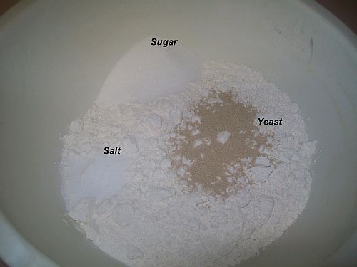 Place the Flour, Salt, Sugar, and Yeast in a Large mixing bowl and stir to combine.