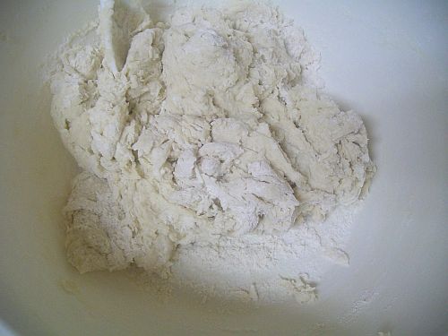 Dump the milk/butter on the flour mix and stir with a big wooden spoon until it has absorbed all the liquid. Dump onto your counter top and begin kneading by hand for about 1 minute, Just trying to incorporate all the flour at this point. Cover and let the dough rest/hydrate for 5 minutes.