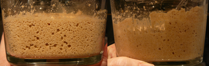 Nov 19 // I got life! I forgot it again, it is 24 hours since I fed it and it is bubbly and rounded and even a little bit risen! Amazing! Can't smell any "sour" still smells like wet amaranth (yuck) or wet corn but I know it is active. I stirred it and forced it to collapse. In stirring I can feel the bubbles or pockets of gas in the starter. Now to dump half and feed again but in the warmer room to help develop the yeasts. I will also start washing the amaranth and adding the water then blending before adding to the starter. The photos are before and after stirring: