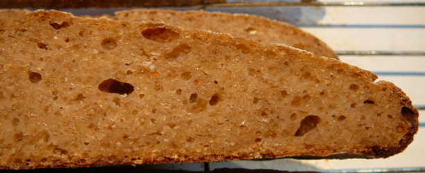 Nov 22 // Started my coffee and sliced the bread, consistancy of moist heavy vollkorn. Taste is gummy. Sour blooms with chewing to very sour and then the amaranth comes in as a surprise aftertaste that quickly fades to nutty. The sour makes the saliva glands produce. Great if you like amaranth jerky. Could even be sliced very thin and dried for trail food. On with the experiments...