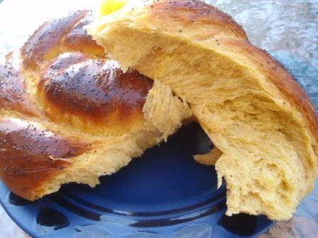 Since I was responsible to bring bread to the Thanksgiving dinner we were invited to, I thought this would be a beautiful addition to the table. I also followed Txfarmer’s lead when it came to the recipe and used Maggie Glezer's "A Blessing of Bread” pumpkin challah one. I have never made challah before, but often bake Zopf and brioches, and the dough consistency is very similar.