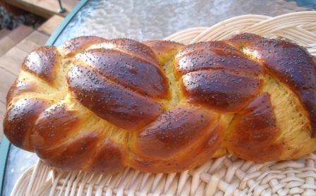 The shape comes from Hamelman’s “Bread” (p. 314-316): you have to make several six-strand braids which are then intertwined. It really wasn’t all that hard since the directions and pictures were very clear. However, I definitely needed to concentrate when I did the braiding and consequently had to shoo everyone out of the kitchen. :)
