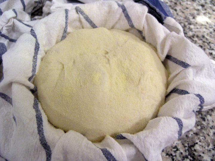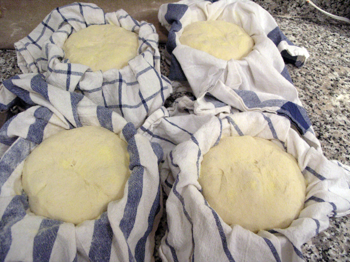 -Remove dough from refrigerator, divide into 4 pieces (574g), shape into boule and transfer to bowl lined with a lightly floured tea towel/linen, or floured bannetton.  Place proofing bowls in large plastic bag to prevent dough from drying out.  Proof for about 2 hours or until dough passes the poke test...