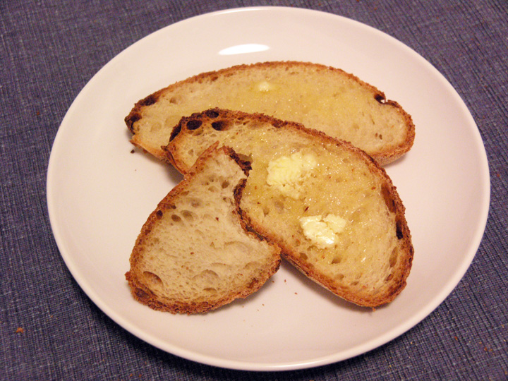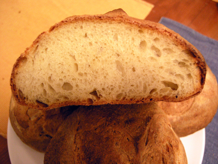 -When loaves are proofed and oven has reached 550F, place loaves on to peel, slash, and place directly onto stone, steam, turn oven temp down to 450F, and bake for 50 minutes, rotating loaves halfway through bake.  Loaves are done when internal temp is between 205F to 210F.