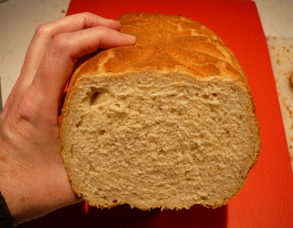 I was given this form for Christmas without any instructions.  As you can see the ingredients add up to just over a kilo of dough, about the right amount to fill this two liter volume form.  The loaf crust is very crunchy and thick.  The crumb slightly chewy and tender.  I removed the top for the last 5 minutes of baking but wished I had removed the whole form to let the bottom brown more as well.   Slices are almost round and crumb is fine.  The oil in the form adds to an almost buttery flaky crust.   This loaf was sliced warm.