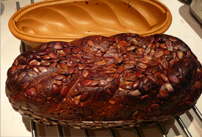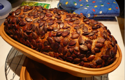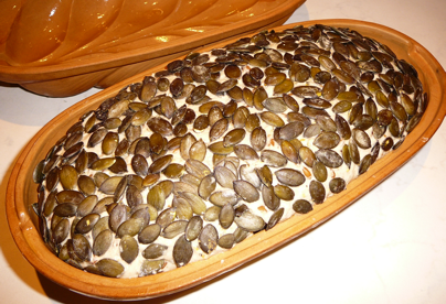 I made a rye sourdough (110g starter/ 500g water/ 300g rye & 200g bread flour/ 7.5g salt) with a mixture of seeds including soaked pre-cooked salted spelt berries and altus and chopped green pumpkin seeds.  I debated what to roll the dough into before plopping it into the cooled and oiled form.   I settled on whole green flat pumpkin seeds.