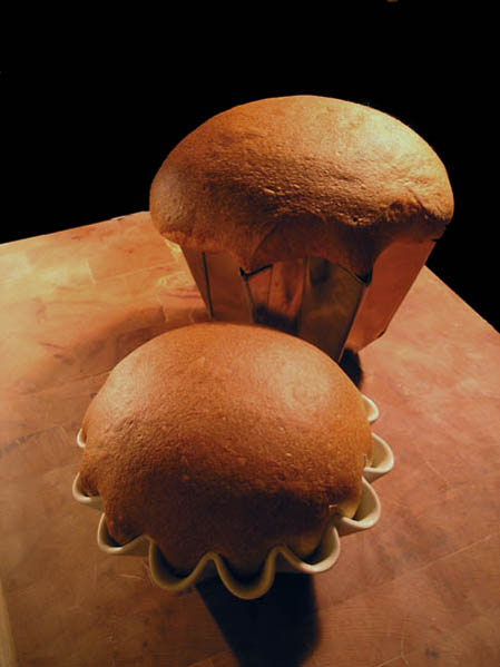 Well.. can you tell what is coming? I crawled into bed about 1 o'clock after making chocolate biscotti, a batch of sour dough challah, stollen and got the Pan D'oro tucked away for it's final rise. It took me a minute to fall asleep but I woke up startled from a dream of sugar plum fairies way too early! I lay in bed thinking I had till noon before I would have to bake them off... and then it hit me..."Oh S***t...I left the proofer set at 85*!" I ran down the stairs and opened the door to the proofer and just laughed when i saw the dough going way over the top of the mold. I quickly turned on the stove to pre-heat and made some coffee. The overflow problem was two fold. When I went on line to see how much dough my Italian mold would take, I made an incorrect assumption. The smaller Portuguese molds takes 500gr. so I thought for that for this big mold, 1000grs did not seen out of line. Wrong. But it was a mistake that could be easily fixed and no one would know (and Sara and I got to taste what I had to cut away.) I must say.... the stollen and the Pan D'oro were the exclamation points to a delicious Christmas Day dinner at Rick and Rita's. (Folks liked the Challah and the double-dipped chocolate biscotti too. ) Hapy New Year to all.