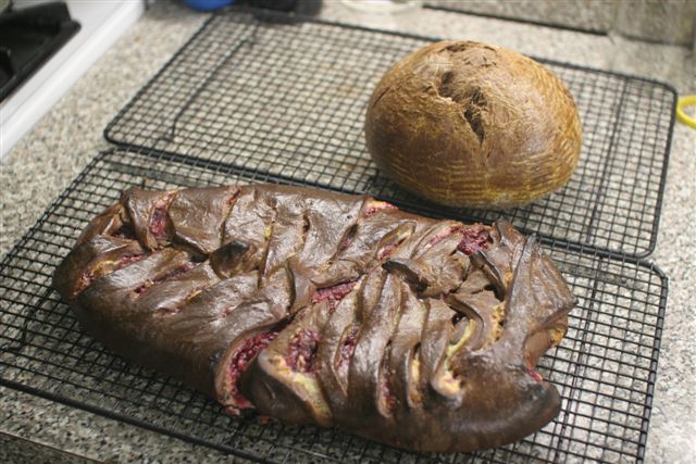 After doing some research I decided to take this in a different direction. Instead of try to force something that makes no sense, I made a chocolate Bread & filled it with cream cheese and raspberries. What can be better than that chocolate & raspberry! The boule looks so good I forgot to slash it but I like the way it cracked even better. Can't wait till they cool. The bread is a leaner bread than the one for Floyd's braid. four, water, yeast, sugar, coco powder & chocolate pieces that's it. Salt also