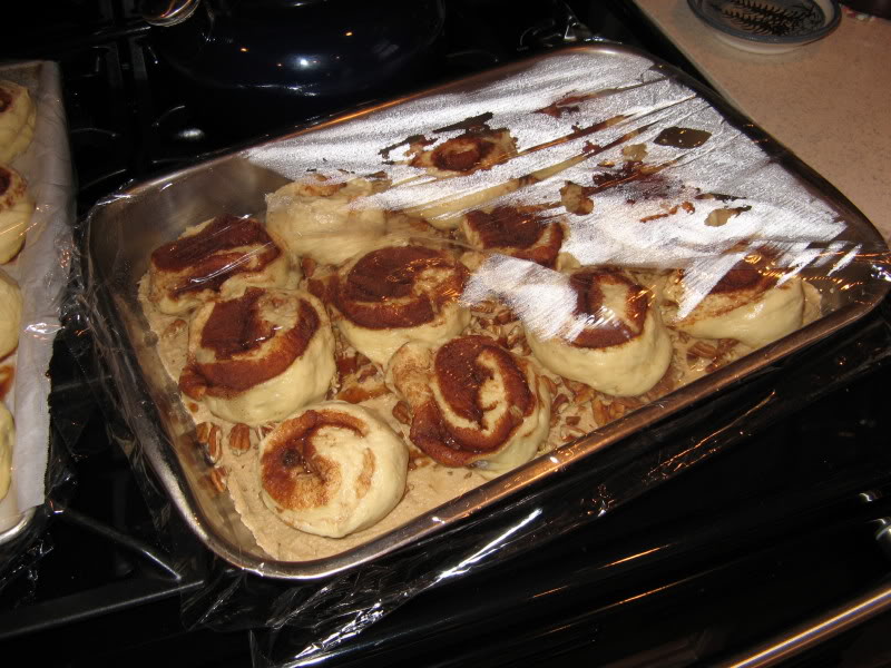 As with the cinnamon rolls, I had to straighten these up as they rose.  You can see the layer of caramel topping in the bottom of the pan, with the bits of pecans.  Reinhart notes that any excess topping can be refrigerated.  Silly man!  We used it all!