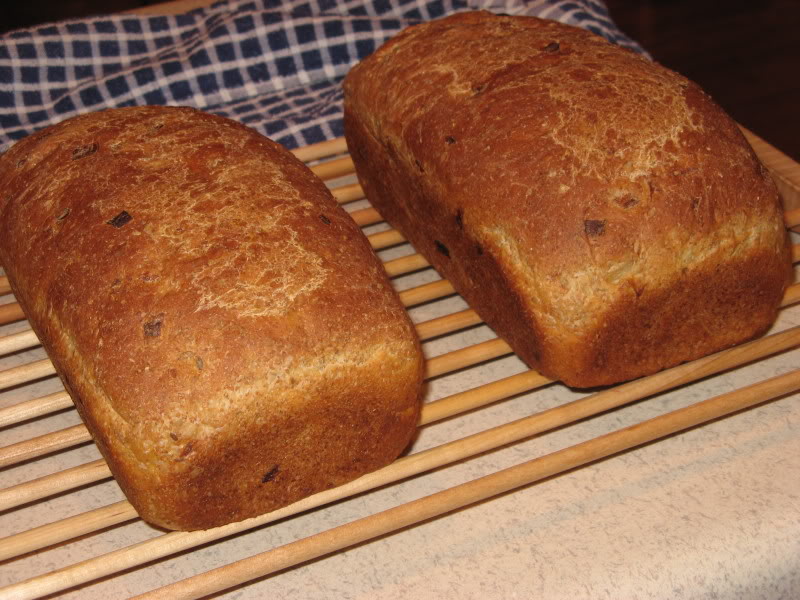 I'm not entirely certain what caused the lighter blotchiness on the top crust, unless maybe it was the spray oil on the plastic that I used to cover the loaves while they fermented.